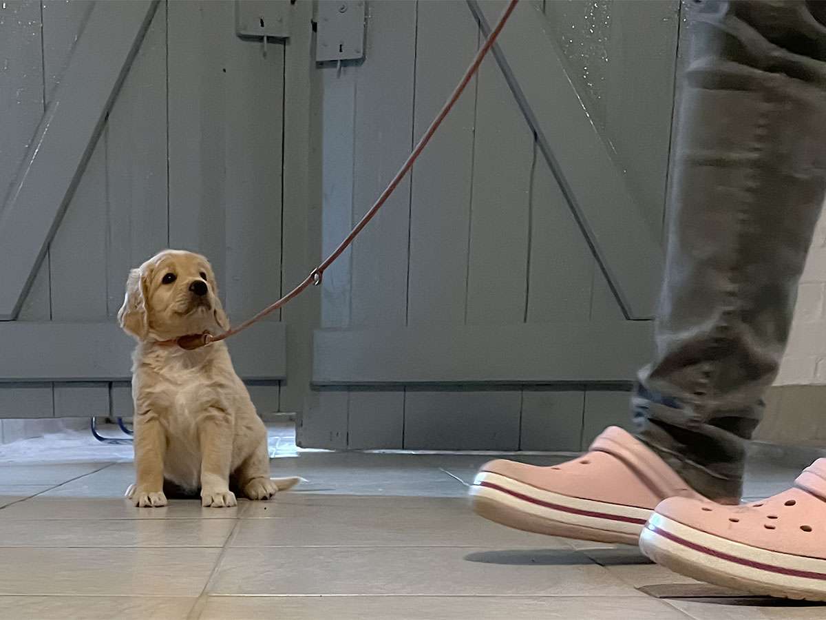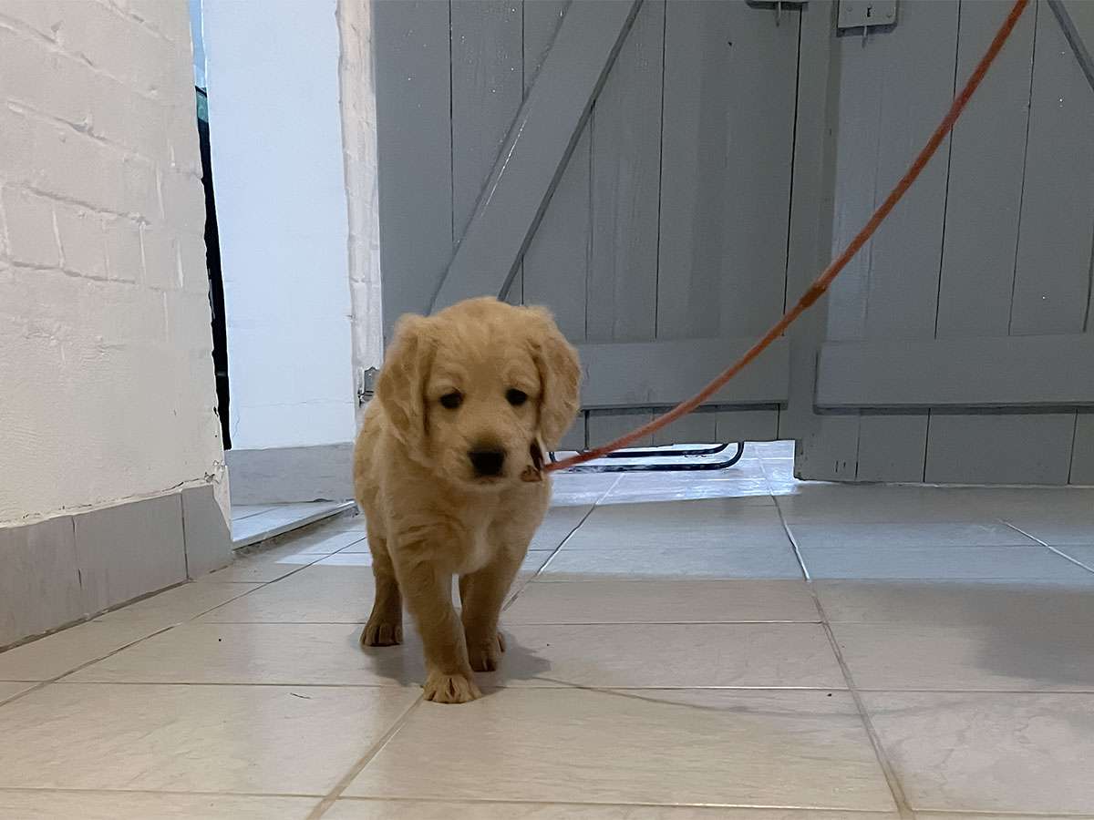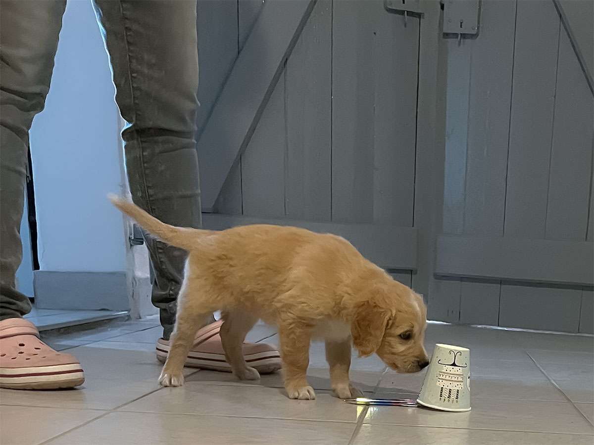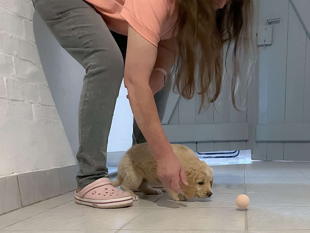 Wenn die Welpen aktiver werden, lernen sie verschiedene Umgebungen kennen, wie andere Räume, oder ich gehe mit ihnen nach draußen – möglichst auch bei unterschiedlichem Wetter. Wichtig sind auch verschiedene Untergründe und Geräusche.